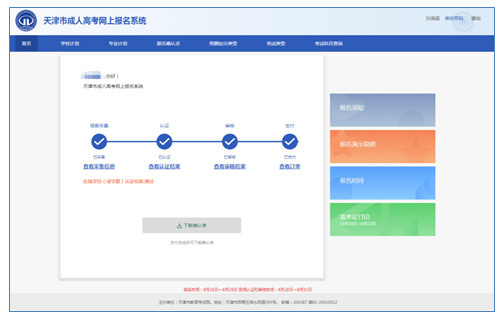10月26日起,考生可登录天津市教育招生考试院官方网站“招考资讯”网(点击进入)首页,访问“公众服务大厅”,进入天津市成人高校招生考试网上报名系统登录页面,输入身份证号和报名时注册的密码、下载准考证后使用A4白色复印纸自行打印。